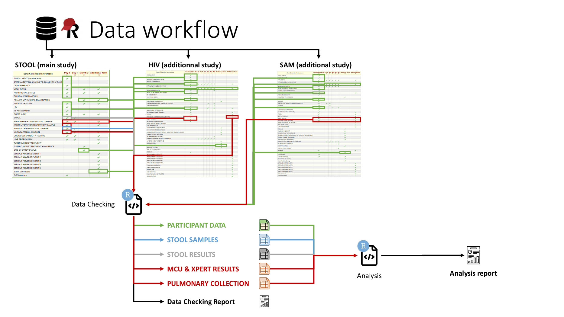 - Statistical analysis : mixed models, diagnostics test performance, Venn diagram